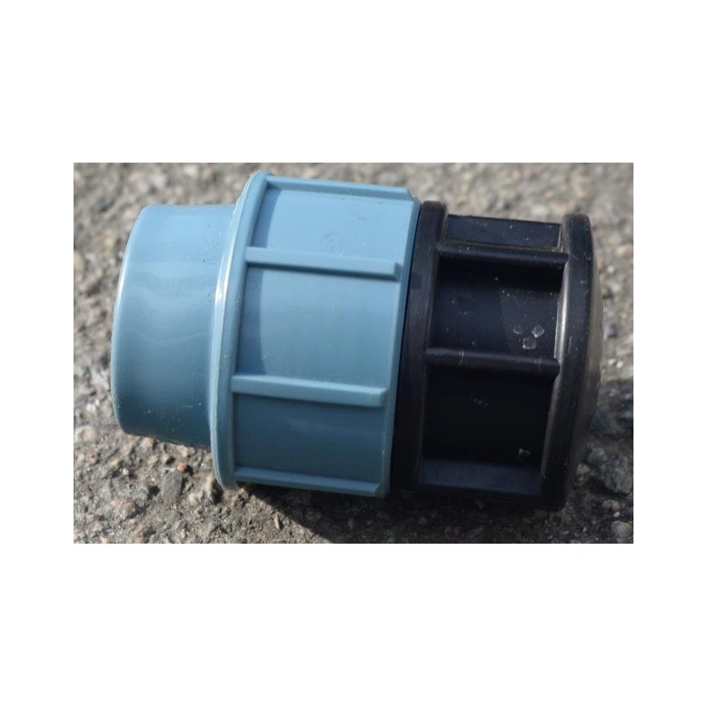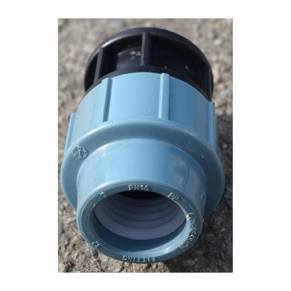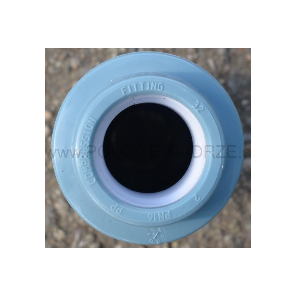 Это конец трубы с заглушкой – заглушка слева на картинке ниже. Это не что иное, как патрубок, который вы будете использовать в том месте, где в будущем захотите продолжить подключение другой трубы. Это сокращение до системы компрессионной муфты ППС для трубы диаметром 32 мм. Это новинка для системы компрессионных муфт PPS. Таким образом можно подключить любое количество резервуаров IBC. Изделие механически стойкое и устойчиво к УФ-излучению.